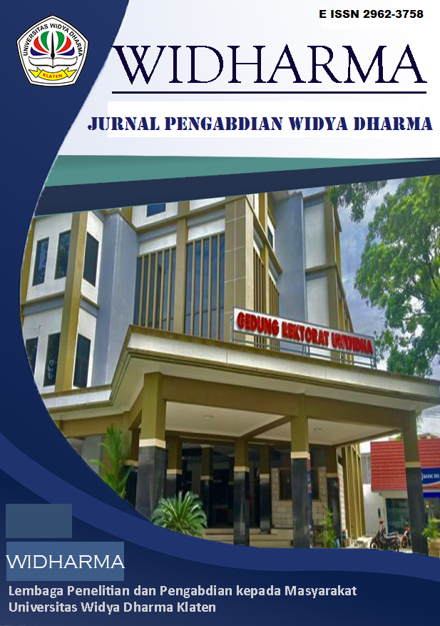 Jurnal Pengabdian Widya Dharma (WIDHARMA) diterbitkan oleh LPPM Universitas Widya Dharma Klaten ini memuat berbagai artikel ilmiah yang menyajikan implementasi disiplin ilmu yang bersinergi dengan masyarakat untuk membantu menyelesaikan permasalahan yang ada dan memberikan pelayanan pada masyarakat.